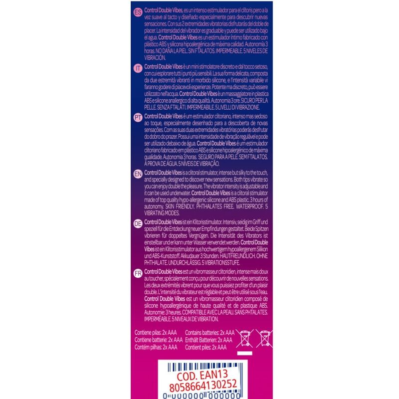 Con sus 2 extremidades vibratorias disfrutarás del doble de place. La intensidad del vibrador es graduable y puede ser utilizado bajo el agua. Control Double Vibes es un estimulador íntimo fabricado con plástico ABS y silicona hipoalergénica de máxima calidad.