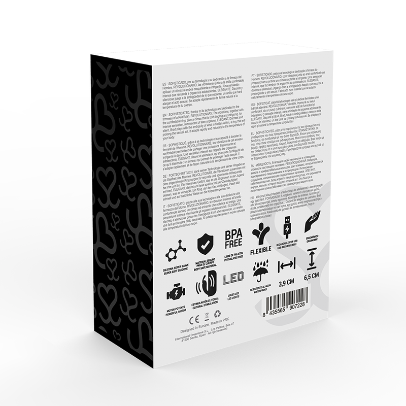 - Brad es de fácil colocación gracias a su anilla flexible, tan solo posicionar Brad en la base del pene y activar mediante el botón superior la rotación que proporciona de forma única estimulación clitorial.